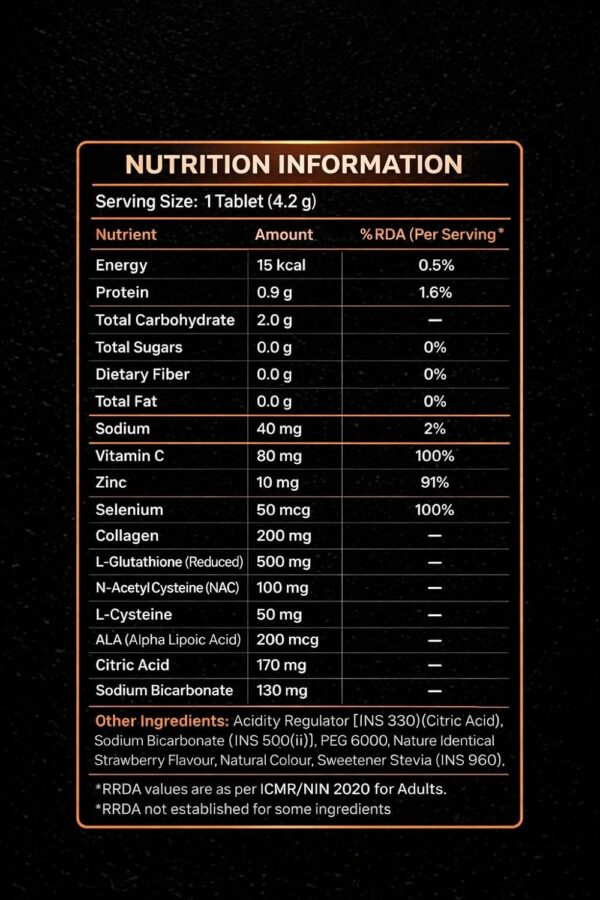 These fast-dissolving tablets create a refreshing strawberry-flavoured drink, making supplementation easy and enjoyable. Designed for modern lifestyles, this formula helps support the body’s natural antioxidant defense system and contributes to maintaining skin health.