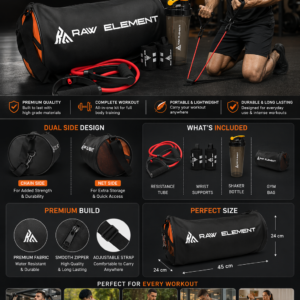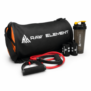 Gym Bag Combo Set with Shaker & Resistance Band | RAW ELEMENT Fitness Kit | Durable Sports Duffel Bag for Gym, Travel & Workout