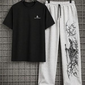 Men’s Oversized Black T-Shirt & Printed Grey Jogger Set | Casual Streetwear Combo for Men